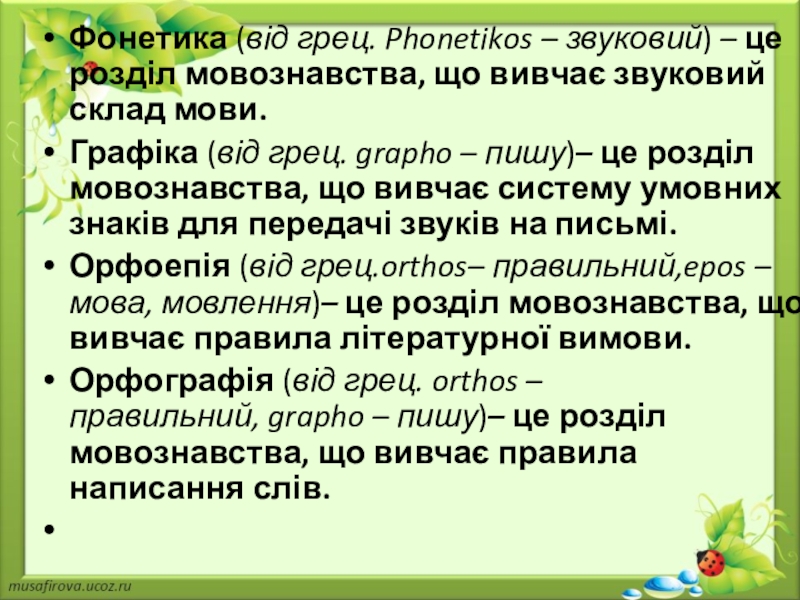 Слайд 4Фонетика (від грец. Phonetikos – звуковий) – це розділ мовознавства, що вивчає