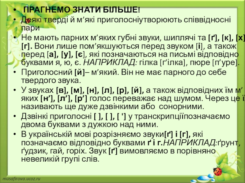 парних м’яких губні звуки, шиплячі та [ґ], [к], [х], [г]. Вони лише пом’якшуються перед звуком [і], а також перед [а], [у], [є], які позначаються на письмі відповідно буквами я, ю, є. НАПРИКЛАД: гілка [г’ілка], пюре [п’уре].