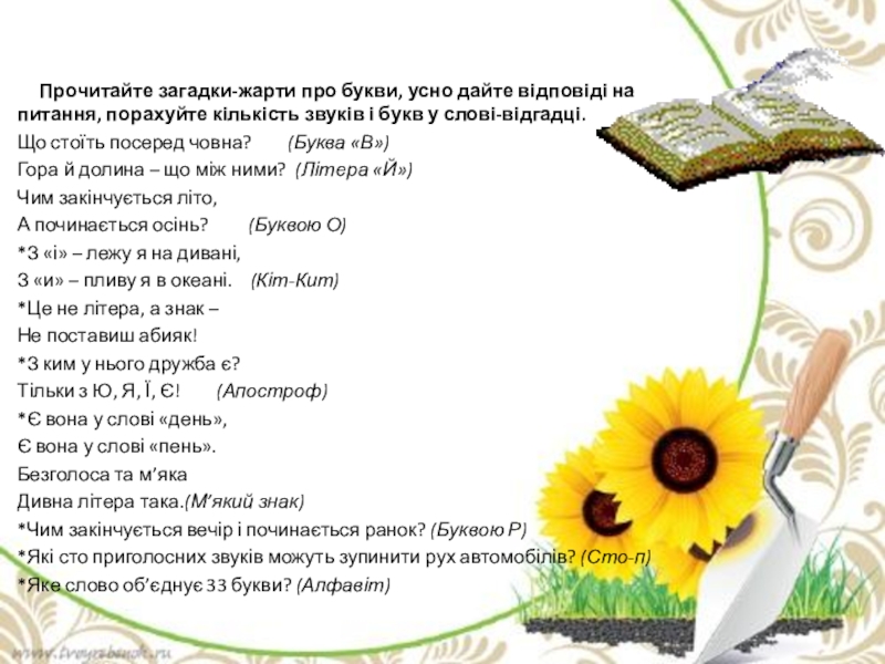 Слайд 9 Прочитайте загадки-жарти про букви, усно дайте відповіді на