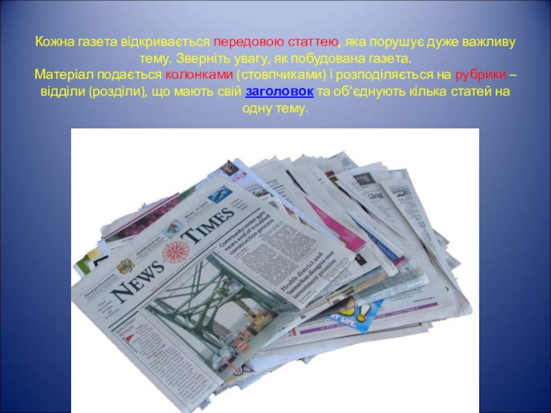 Слайд 16Кожна газета відкривається передовою статтею, яка порушує дуже важливу тему. Зверніть