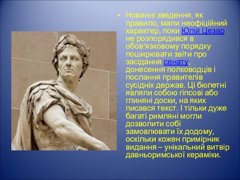 Новинні зведення, як правило, мали неофіційний характер, поки Юлій Цезар не