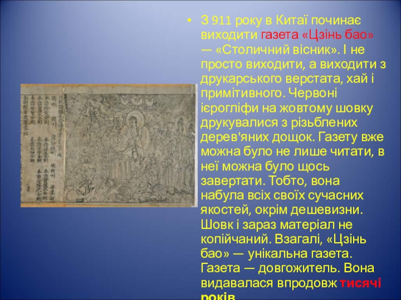 «Столичний вісник». І не просто виходити, а виходити з друкарського верстата, хай і примітивного. Червоні ієрогліфи на жовтому шовку друкувалися з різьблених дерев'яних дощок. Газету вже можна було не лише читати, в неї можна було щось завертати. Тобто, вона набула всіх своїх сучасних якостей, окрім дешевизни. Шовк і зараз матеріал не копійчаний. Взагалі, «Цзінь бао» — унікальна газета. Газета — довгожитель. Вона видавалася впродовж тисячі років.