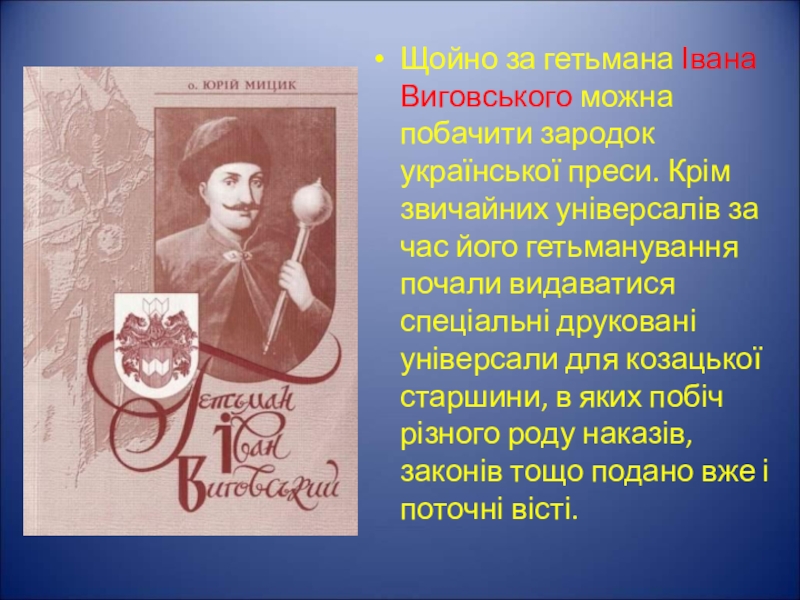 Щойно за гетьмана Івана Виговського можна побачити зародок української преси. Крім