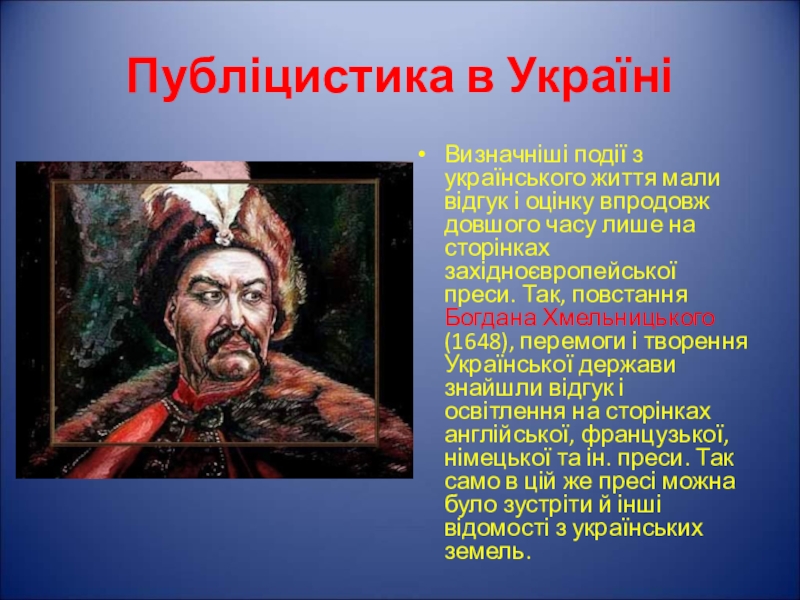 впродовж довшого часу лише на сторінках західноєвропейської преси. Так, повстання Богдана Хмельницького (1648), перемоги і творення Української держави знайшли відгук і освітлення на сторінках англійської, французької, німецької та ін. преси. Так само в цій же пресі можна було зустріти й інші відомості з українських земель.
