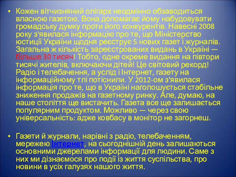 громадську думку проти його конкурентів. Навесні 2008 року з'явилася інформацію про те, що Міністерство юстиції України щодня реєструє 5 нових газет і журналів. Загальна ж кількість зареєстрованих видань в Україні — більше 30 тисяч! Тобто, одне окреме видання на півтори тисячі жителів, включаючи дітей! Це світовий рекорд! Радіо і телебачення, а услід і Інтернет, газету на інформаційному тлі потіснили. У 2012-ом з'явилася інформація про те, що в Україні наголошується стабільне зниження продажів на газетному ринку. Але, думаю, на наше століття ще вистачить. Газета все ще залишається популярним продуктом. Можливо — через свою універсальність: адже ковбасу в монітор не загорнеш.