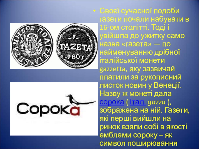 увійшла до ужитку само назва «газета» — по найменуванню дрібної італійської монети gazzetta, яку зазвичай платили за рукописний листок новин у Венеції. Назву ж монеті дала сорока ( італ. gazza ), зображена на ній. Газети, які перші вийшли на ринок взяли собі в якості емблеми сороку – як символ поширювання новин.