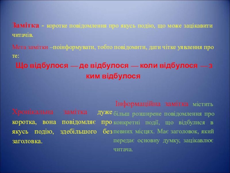 навчити учнів складати замітку в газету інформаційного характеру; повторити матеріал про особливості публіцистичного стилю;