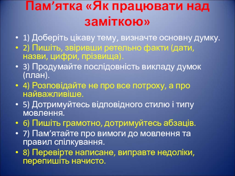 Слайд 20Пам’ятка «Як працювати над заміткою»