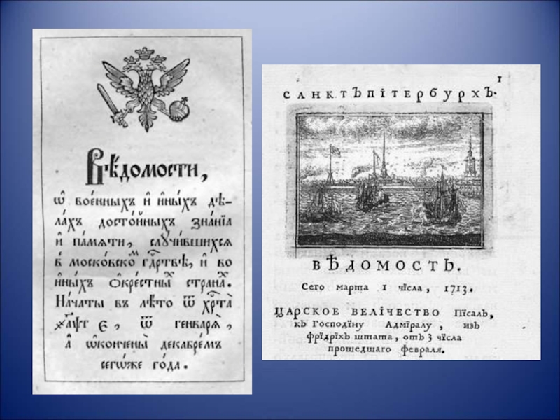 I "Відомості про військових і інших справах, гідних знання і пам'яті, що трапилися в Московській державі і інших навколишніх країнах". Перший лист цієї друкованої газети з'явився в Москві 2 січня 1703. Її наклад склав 1000 екземплярів, ціна — 2 копійки. Коректуру в ній робив сам цар-батюшка.