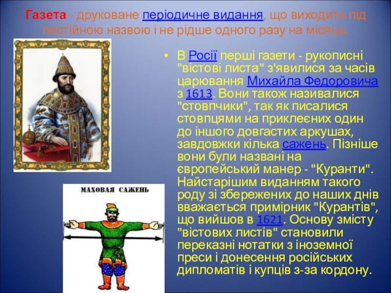 В Росії перші газети - рукописні "вістові листа" з'явилися за часів царювання Михайла Федоровича з 1613. Вони також називалися "стовпчики", так як писалися стовпцями на приклеєних один до іншого довгастих аркушах, завдовжки кілька сажень. Пізніше вони були названі на європейський манер - "Куранти". Найстарішим виданням такого роду зі збережених до наших днів вважається примірник "Курантів", що вийшов в 1621. Основу змісту "вістових листів" становили переказні нотатки з іноземної преси і донесення російських дипломатів і купців з-за кордону.