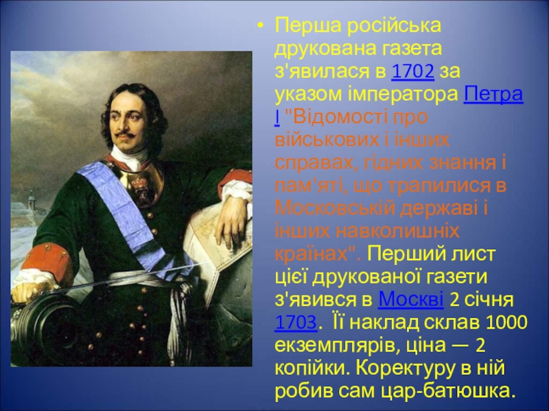 Перша російська друкована газета з'явилася в 1702 за указом імператора Петра