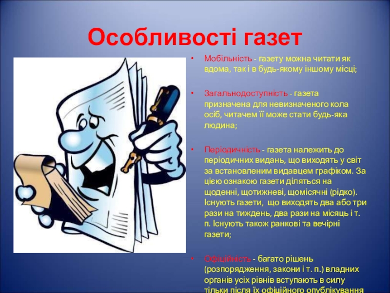 Загальнодоступність - газета призначена для невизначеного кола осіб, читачем її може стати будь-яка людина;