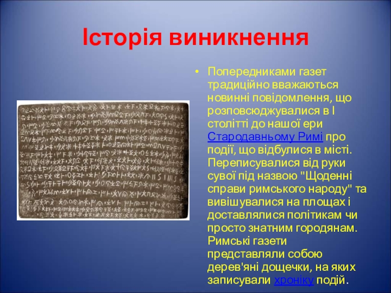 І столітті до нашої ери Стародавньому Римі про події, що відбулися в місті. Переписувалися від руки сувої під назвою "Щоденні справи римського народу" та вивішувалися на площах і доставлялися політикам чи просто знатним городянам. Римські газети представляли собою дерев'яні дощечки, на яких записували хроніку подій.