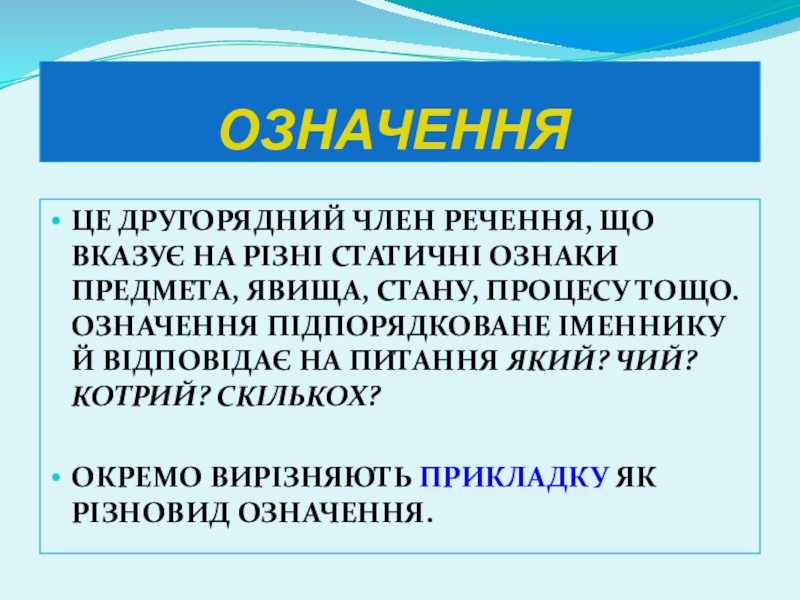 ЩО ВКАЗУЄ НА РІЗНІ СТАТИЧНІ ОЗНАКИ ПРЕДМЕТА, ЯВИЩА, СТАНУ, ПРОЦЕСУ ТОЩО. ОЗНАЧЕННЯ ПІДПОРЯДКОВАНЕ ІМЕННИКУ Й ВІДПОВІДАЄ НА ПИТАННЯ ЯКИЙ? ЧИЙ? КОТРИЙ? СКІЛЬКОХ?