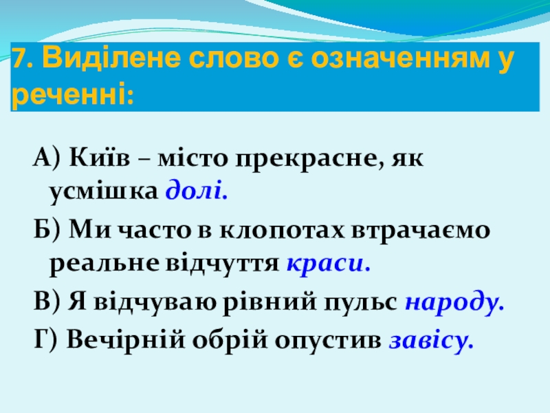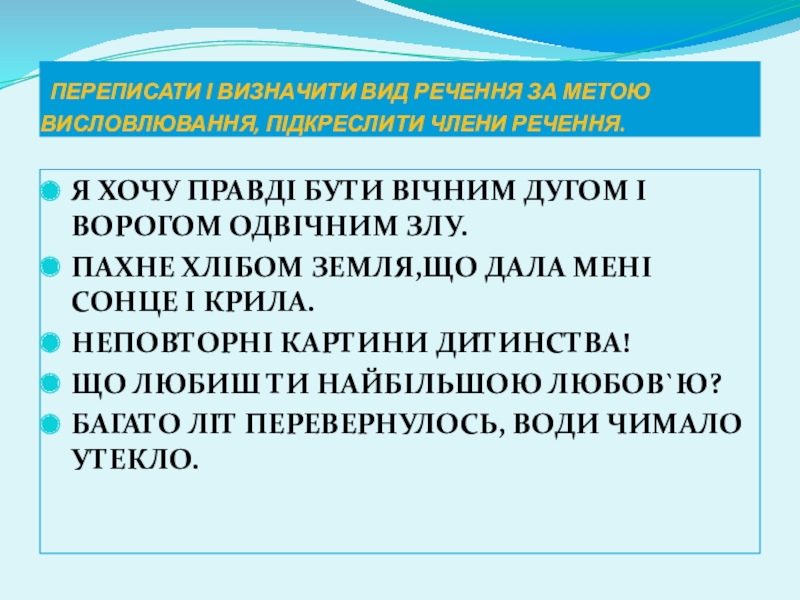 Слайд 36 ПЕРЕПИСАТИ І ВИЗНАЧИТИ ВИД РЕЧЕННЯ ЗА МЕТОЮ ВИСЛОВЛЮВАННЯ, ПІДКРЕСЛИТИ ЧЛЕНИ