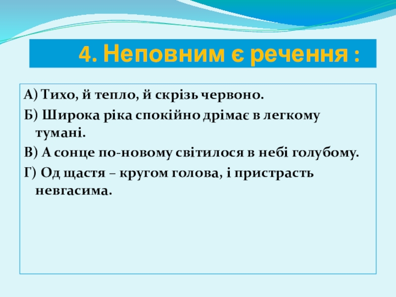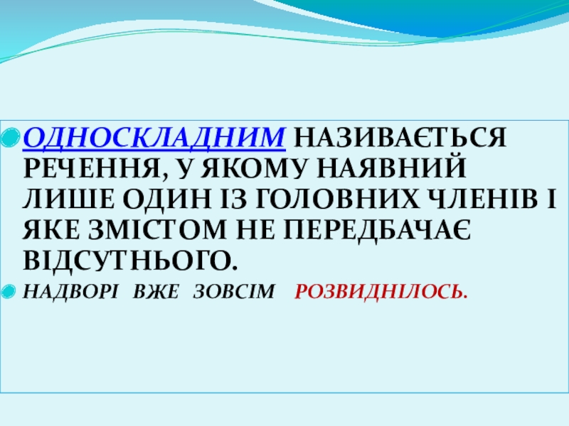 Слайд 26ОДНОСКЛАДНИМ НАЗИВАЄТЬСЯ РЕЧЕННЯ, У ЯКОМУ НАЯВНИЙ ЛИШЕ ОДИН ІЗ ГОЛОВНИХ ЧЛЕНІВ