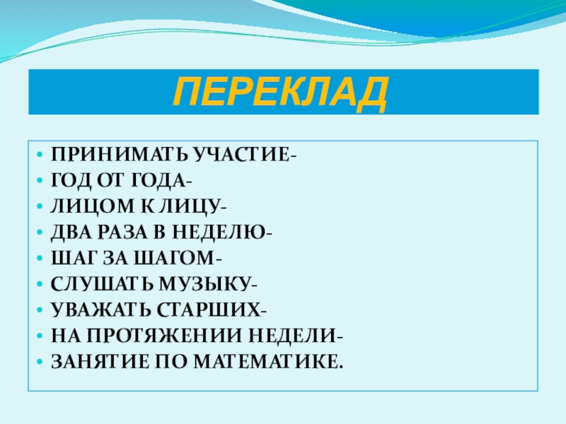 ПО СУБОТАМ; ХВОРИЙ ГРИПОМ; СМІЯТИСЯ НАД СОБОЮ; ВЛАСТИВИЙ ДЛЯ РИНКОВОЇ ЕКОНОМІКИ; ЗГІДНО НАКАЗУ ДИРЕКТОРА; ДОГЛЯДАТИ ЗА ХВОРИМ; ГОВОРИТИ НА УКРАЇНСЬКІЙ МОВІ.