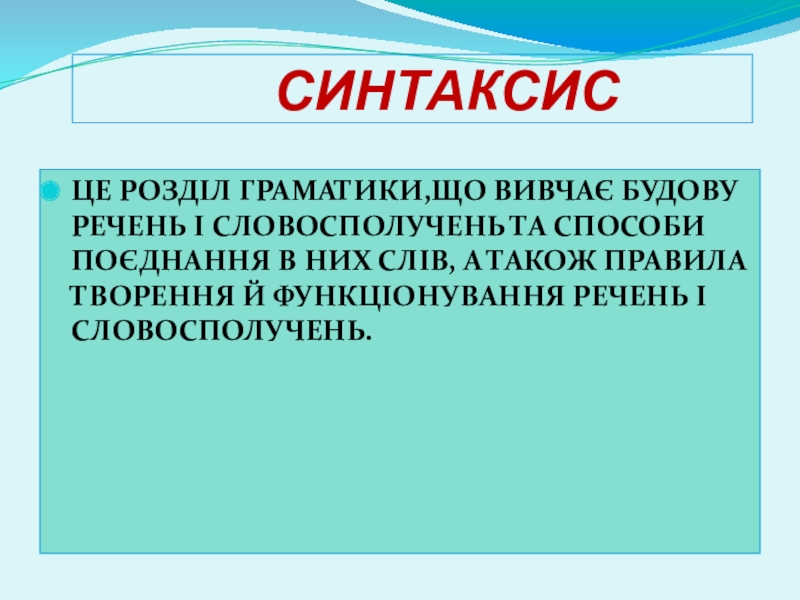 ВИВЧАЄ БУДОВУ РЕЧЕНЬ І СЛОВОСПОЛУЧЕНЬ ТА СПОСОБИ ПОЄДНАННЯ В НИХ СЛІВ, А ТАКОЖ ПРАВИЛА ТВОРЕННЯ Й ФУНКЦІОНУВАННЯ РЕЧЕНЬ І СЛОВОСПОЛУЧЕНЬ.