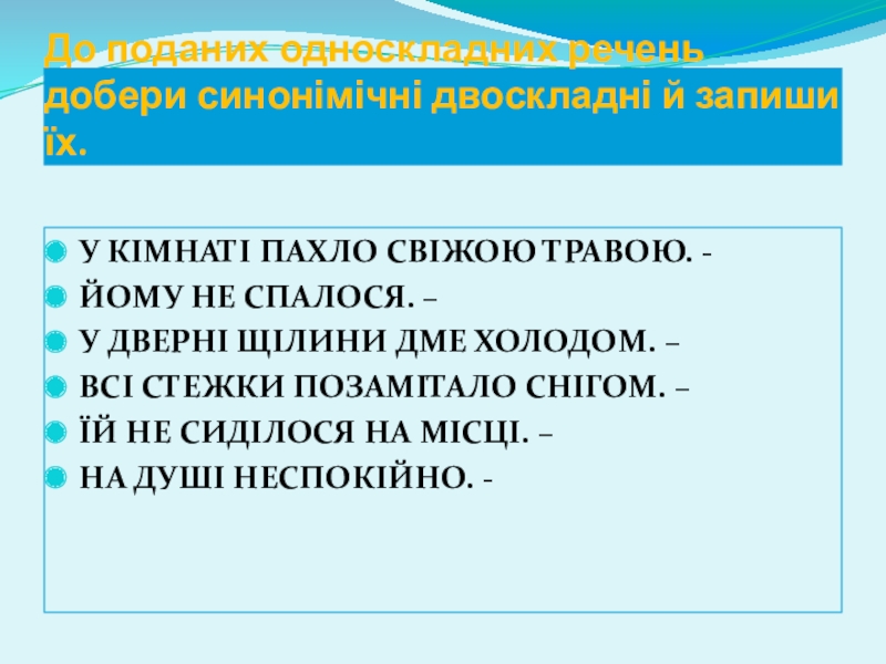 Слайд 39До поданих односкладних речень добери синонімічні двоскладні й запиши їх.