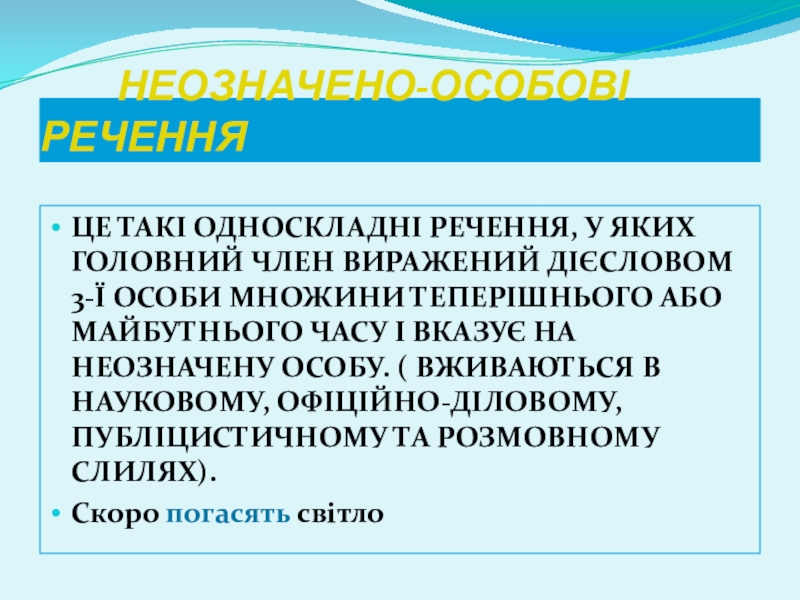 ГОЛОВНИЙ ЧЛЕН ВИРАЖЕНИЙ ДІЄСЛОВОМ 3-Ї ОСОБИ МНОЖИНИ ТЕПЕРІШНЬОГО АБО МАЙБУТНЬОГО ЧАСУ І ВКАЗУЄ НА НЕОЗНАЧЕНУ ОСОБУ. ( ВЖИВАЮТЬСЯ В НАУКОВОМУ, ОФІЦІЙНО-ДІЛОВОМУ, ПУБЛІЦИСТИЧНОМУ ТА РОЗМОВНОМУ СЛИЛЯХ).