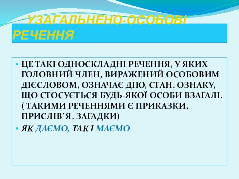 ЧЛЕН, ВИРАЖЕНИЙ ОСОБОВИМ ДІЄСЛОВОМ, ОЗНАЧАЄ ДІЮ, СТАН. ОЗНАКУ, ЩО СТОСУЄТЬСЯ БУДЬ-ЯКОЇ ОСОБИ ВЗАГАЛІ. ( ТАКИМИ РЕЧЕННЯМИ Є ПРИКАЗКИ, ПРИСЛІВ`Я, ЗАГАДКИ)