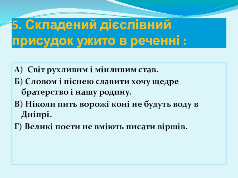 Слайд 485. Складений дієслівний присудок ужито в реченні :