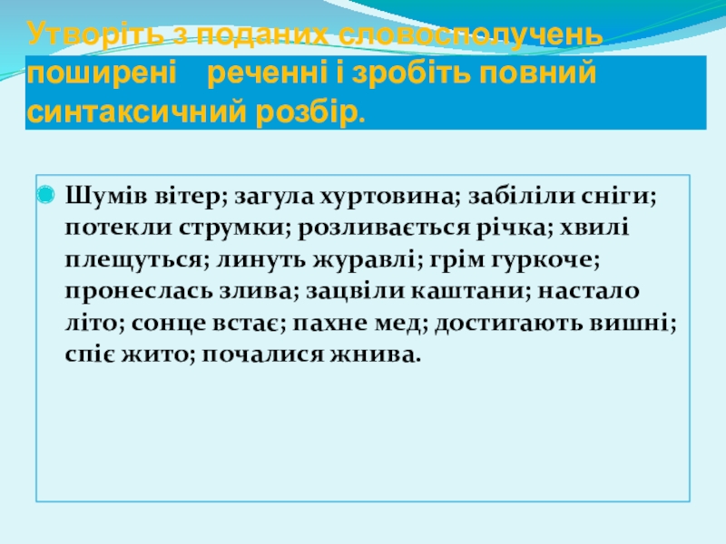 Слайд 37Утворіть з поданих словосполучень поширені реченні і зробіть повний синтаксичний