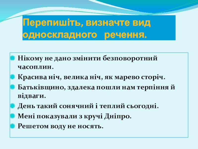 Слайд 42Перепишіть, визначте вид односкладного речення.
