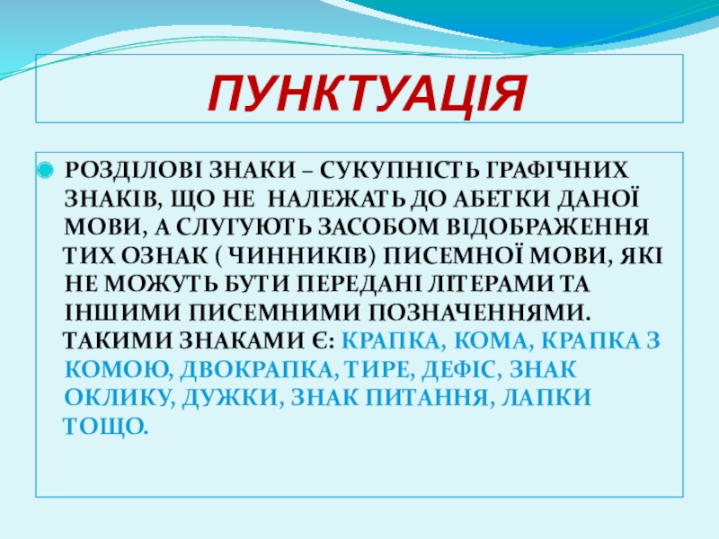 СУКУПНІСТЬ ГРАФІЧНИХ ЗНАКІВ, ЩО НЕ НАЛЕЖАТЬ ДО АБЕТКИ ДАНОЇ МОВИ, А СЛУГУЮТЬ ЗАСОБОМ ВІДОБРАЖЕННЯ ТИХ ОЗНАК ( ЧИННИКІВ) ПИСЕМНОЇ МОВИ, ЯКІ НЕ МОЖУТЬ БУТИ ПЕРЕДАНІ ЛІТЕРАМИ ТА ІНШИМИ ПИСЕМНИМИ ПОЗНАЧЕННЯМИ. ТАКИМИ ЗНАКАМИ Є: КРАПКА, КОМА, КРАПКА З КОМОЮ, ДВОКРАПКА, ТИРЕ, ДЕФІС, ЗНАК ОКЛИКУ, ДУЖКИ, ЗНАК ПИТАННЯ, ЛАПКИ ТОЩО.