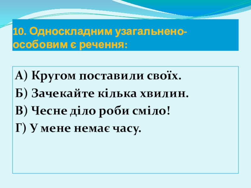 Слайд 5310. Односкладним узагальнено-особовим є речення: