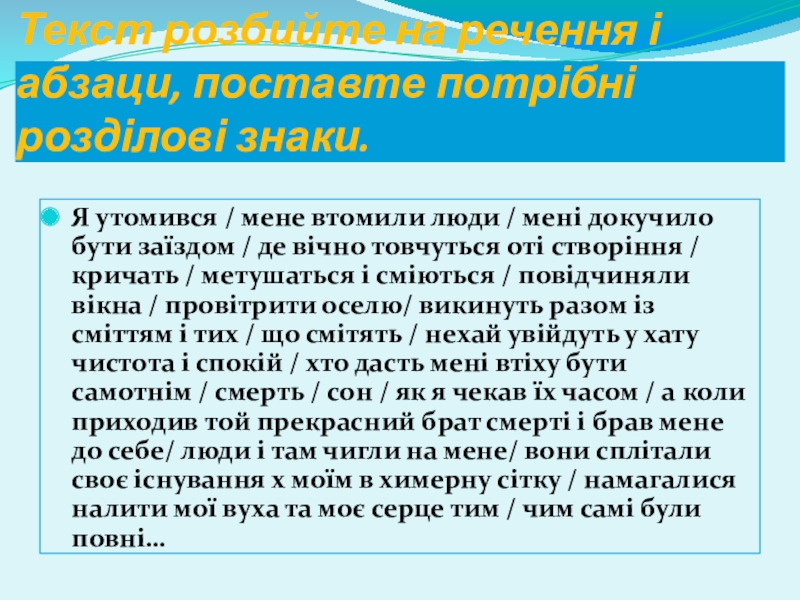 Слайд 38Текст розбийте на речення і абзаци, поставте потрібні розділові знаки.