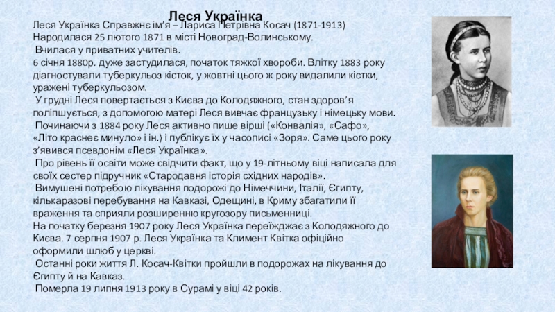 Леся Українка Справжнє ім’я – Лариса Петрівна Косач (1871-1913)