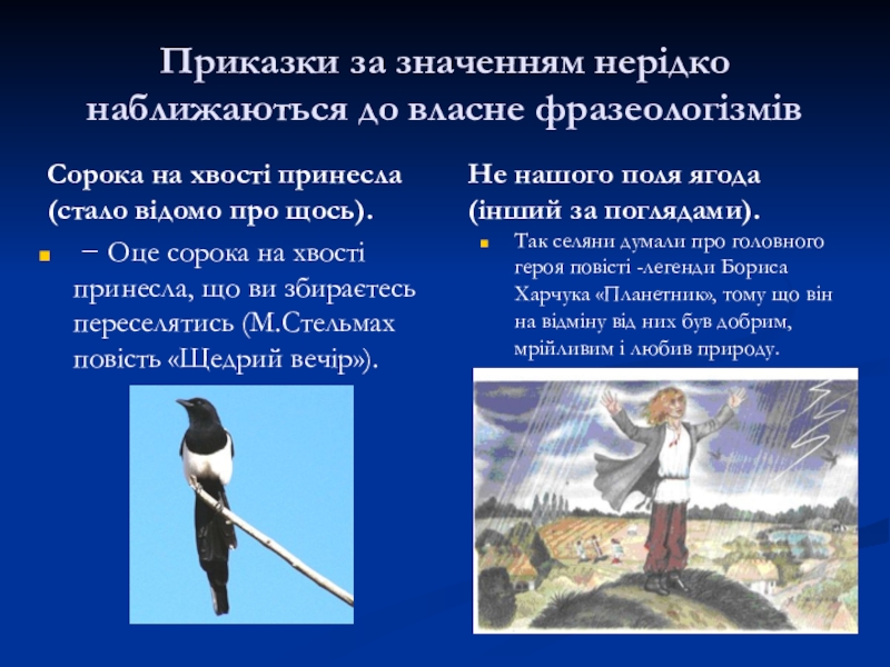 Так селяни думали про головного героя повісті -легенди Бориса Харчука «Планетник», тому що він на відміну від них був добрим, мрійливим і любив природу.