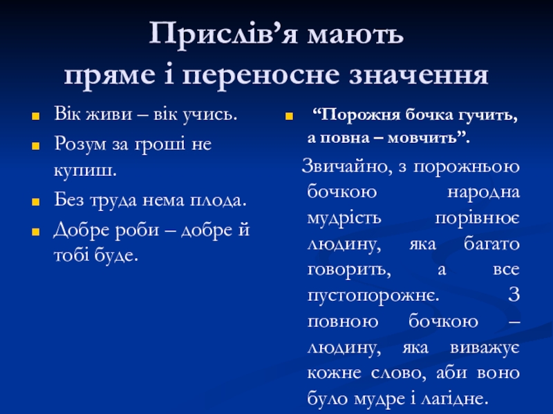 Звичайно, з порожньою бочкою народна мудрість порівнює людину, яка багато говорить, а все пустопорожнє. З повною бочкою – людину, яка виважує кожне слово, аби воно було мудре і лагідне.