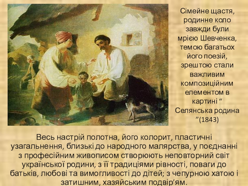 Весь настрій полотна, його колорит, пластичні узагальнення, близькі до народного малярства, у поєднанні з професійним живописом створюють неповторний світ української родини, з її традиціями рівності, поваги до батьків, любові та вимогливості до дітей; з чепурною хатою і затишним, хазяйським подвір’ям.