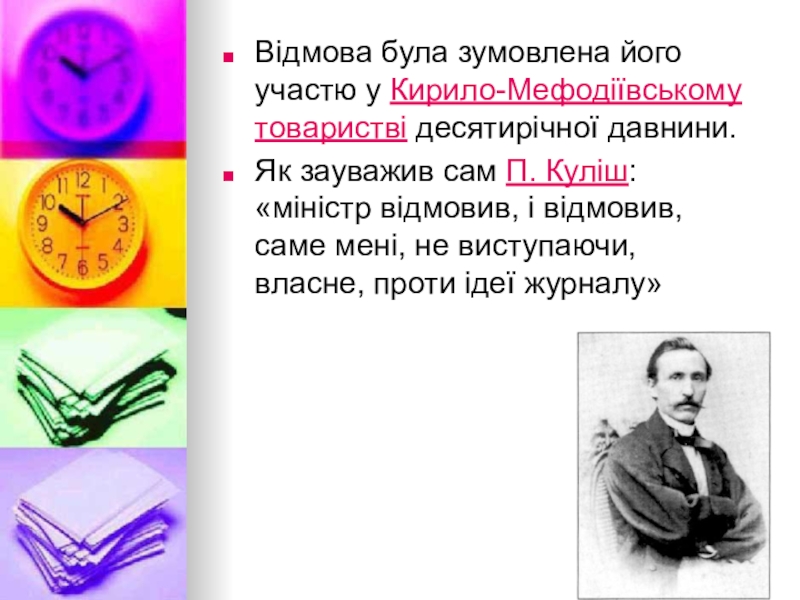 Слайд 13Відмова була зумовлена його участю у Кирило-Мефодіївському товаристві десятирічної давнини.
