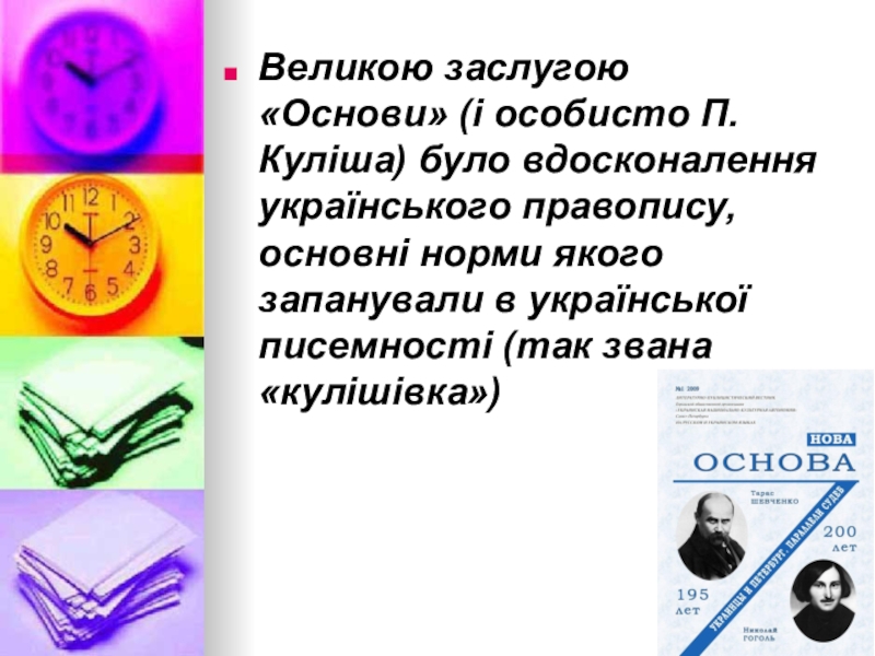 Слайд 23Великою заслугою «Основи» (і особисто П. Куліша) було вдосконалення українського правопису,