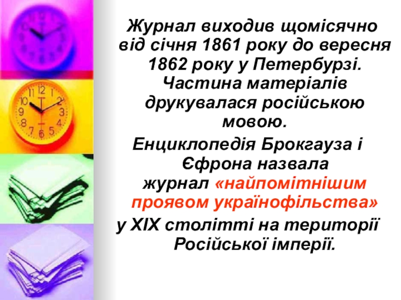 Слайд 5 Журнал виходив щомісячно від січня 1861 року до вересня 1862 року у Петербурзі. Частина матеріалів