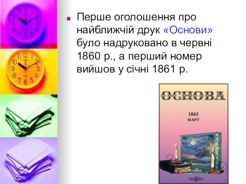 Слайд 15Перше оголошення про найближчій друк «Основи» було надруковано в червні 1860 р.,