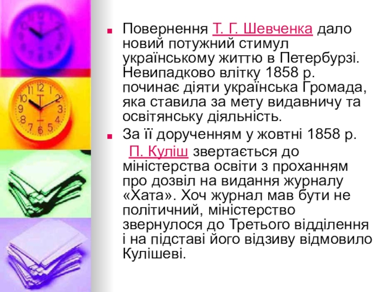 Слайд 12Повернення Т. Г. Шевченка дало новий потужний стимул українському життю в Петербурзі. Невипадково влітку 1858 р.