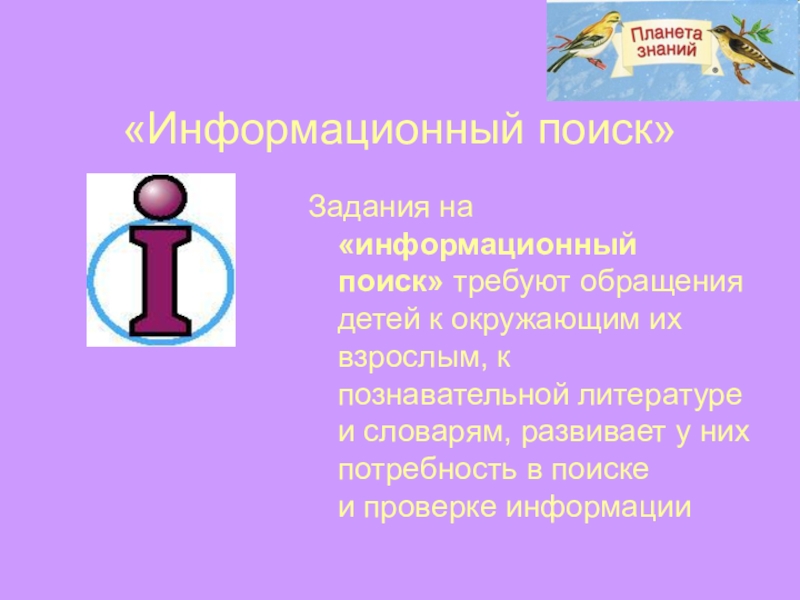 «Информационный поиск»Задания на «информационный поиск» требуют обращения детей к окружающим их взрослым, к познавательной литературе