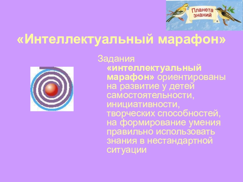 «Интеллектуальный марафон»Задания «интеллектуальный марафон» ориентированы  на развитие у детей самостоятельности, инициативности, творческих способностей,