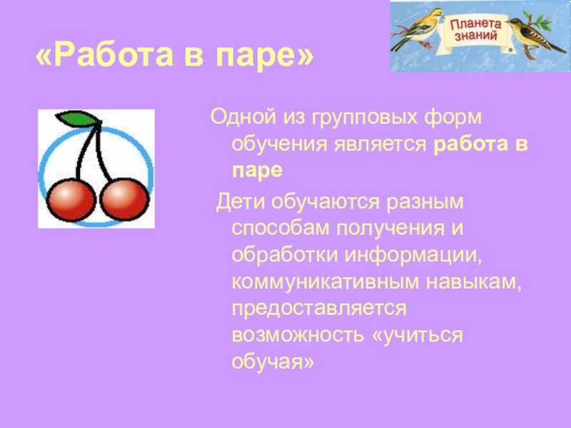 «Работа в паре»Одной из групповых форм обучения является работа в паре Дети обучаются разным способам получения и