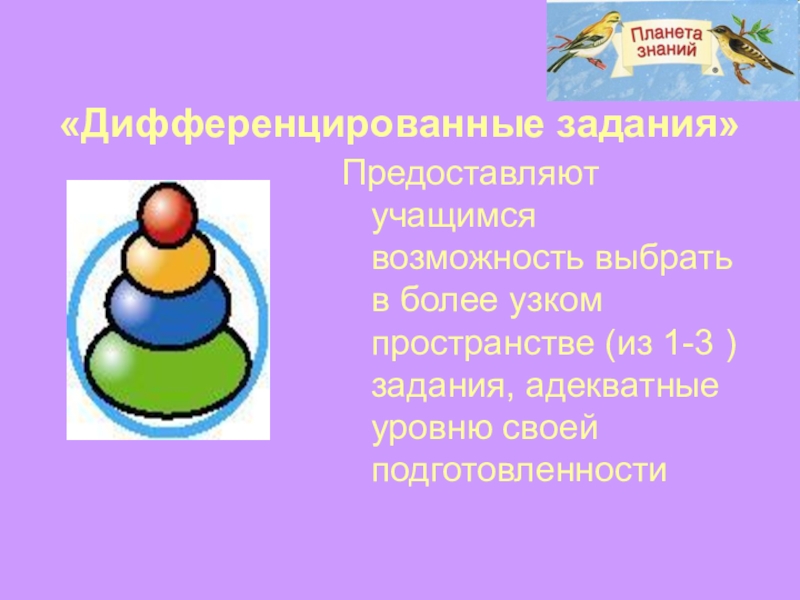 «Дифференцированные задания»Предоставляют учащимся возможность выбрать в более узком пространстве (из 1-3 ) задания, адекватные уровню