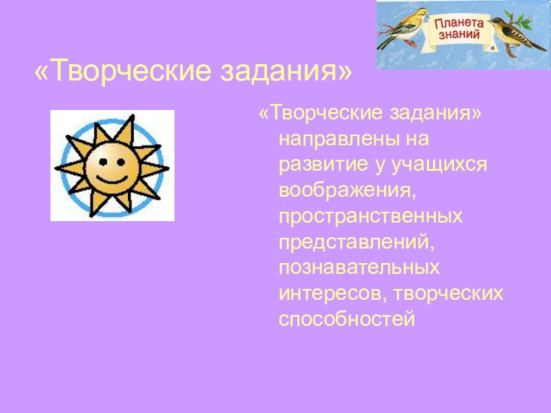«Творческие задания»«Творческие задания» направлены на развитие у учащихся воображения, пространственных представлений, познавательных интересов, творческих способностей