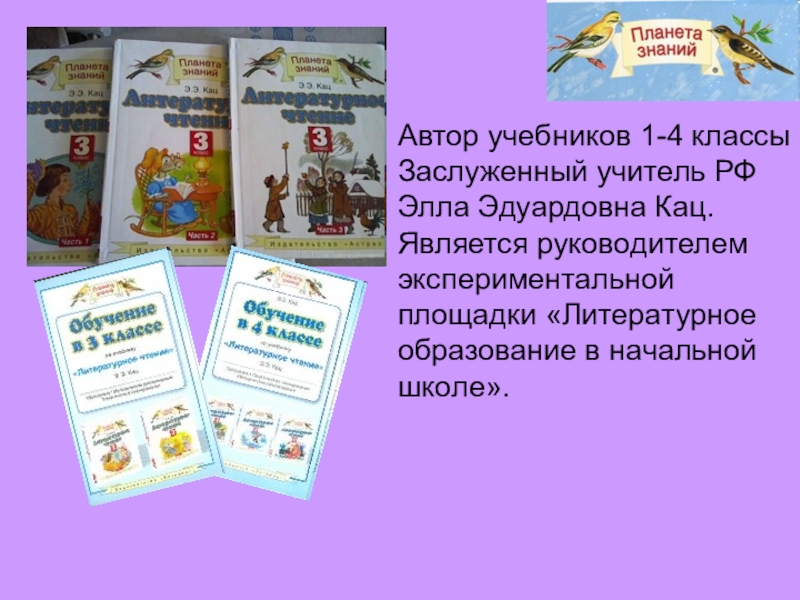 Автор учебников 1-4 классыЗаслуженный учитель РФЭлла Эдуардовна Кац.Является руководителем экспериментальной площадки «Литературноеобразование в начальной школе».