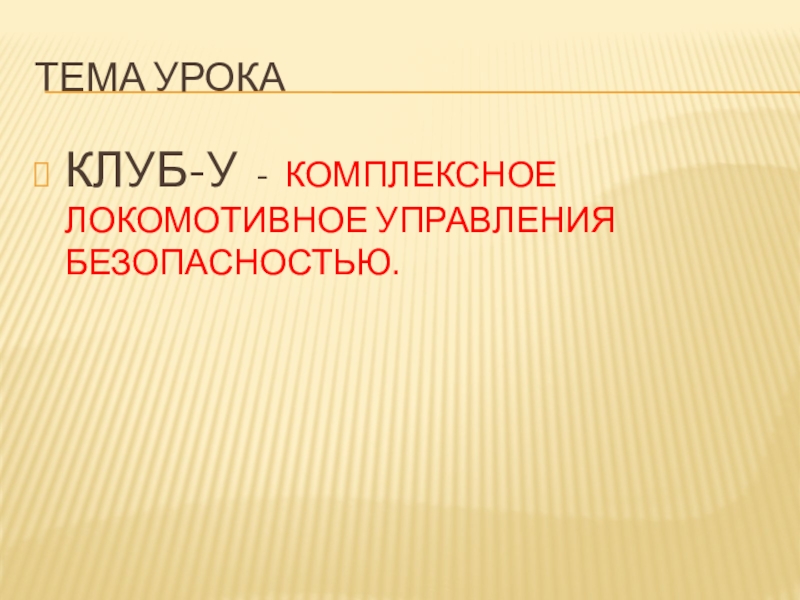 ТЕМА УРОКА КЛУБ-У - КОМПЛЕКСНОЕ ЛОКОМОТИВНОЕ УПРАВЛЕНИЯ БЕЗОПАСНОСТЬЮ.