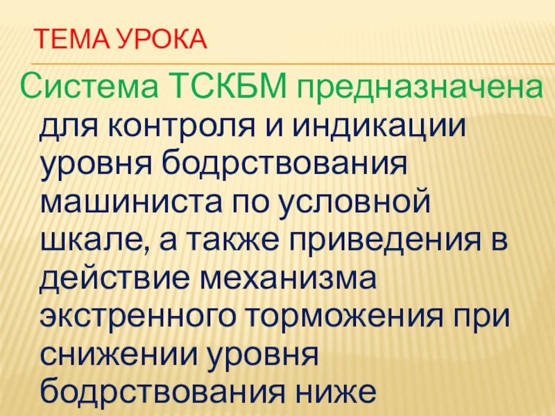 ТЕМА УРОКА Cистема ТСКБМ предназначена для контроля и индикации уровня бодрствования машиниста по условной шкале, а также