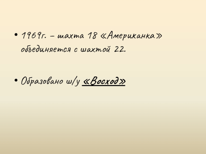 1969г. – шахта 18 «Американка» объединяется с шахтой 22.Образовано ш/у «Восход»