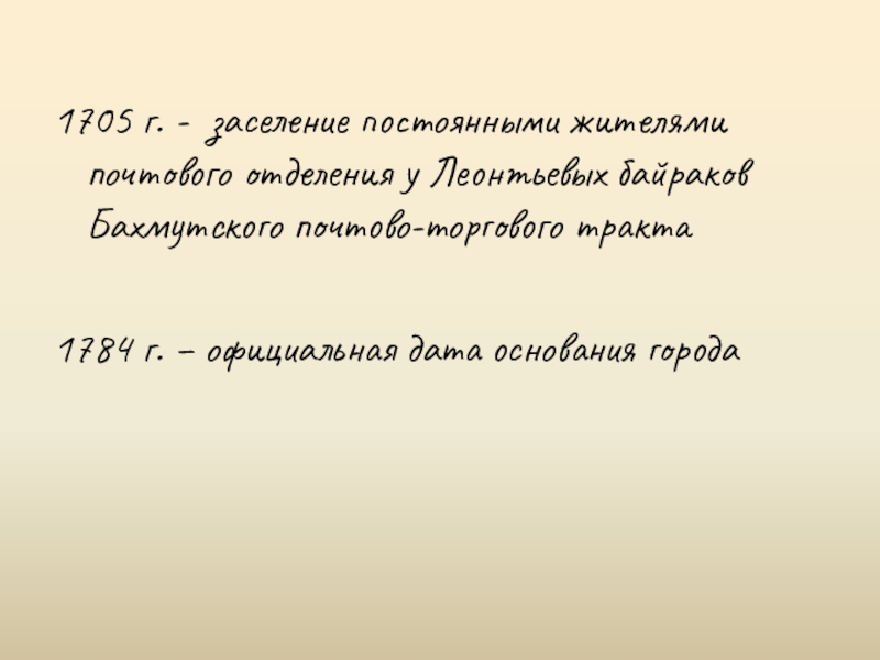 1705 г. - заселение постоянными жителями почтового отделения у Леонтьевых байраков Бахмутского почтово-торгового тракта1784 г. – официальная